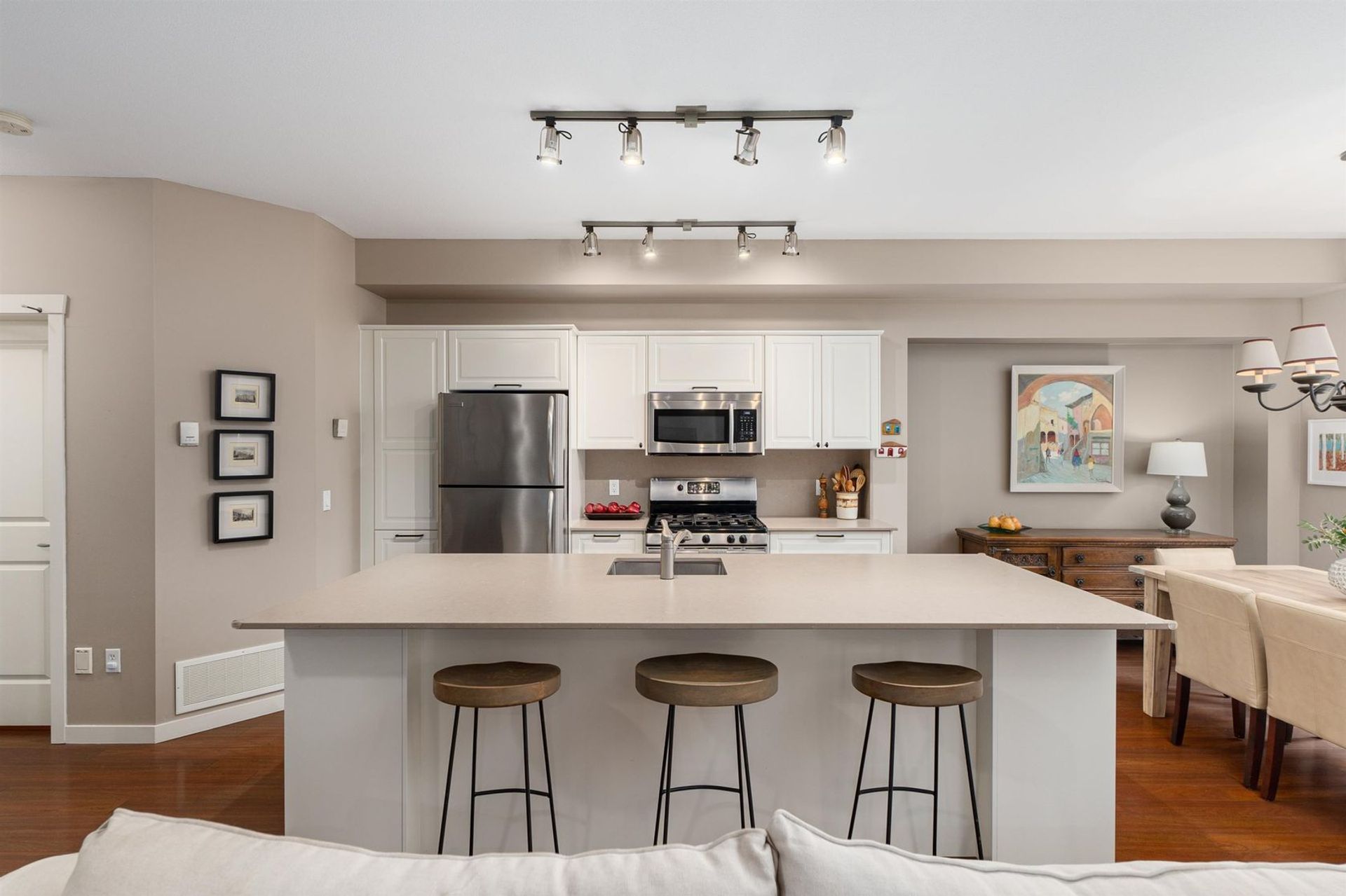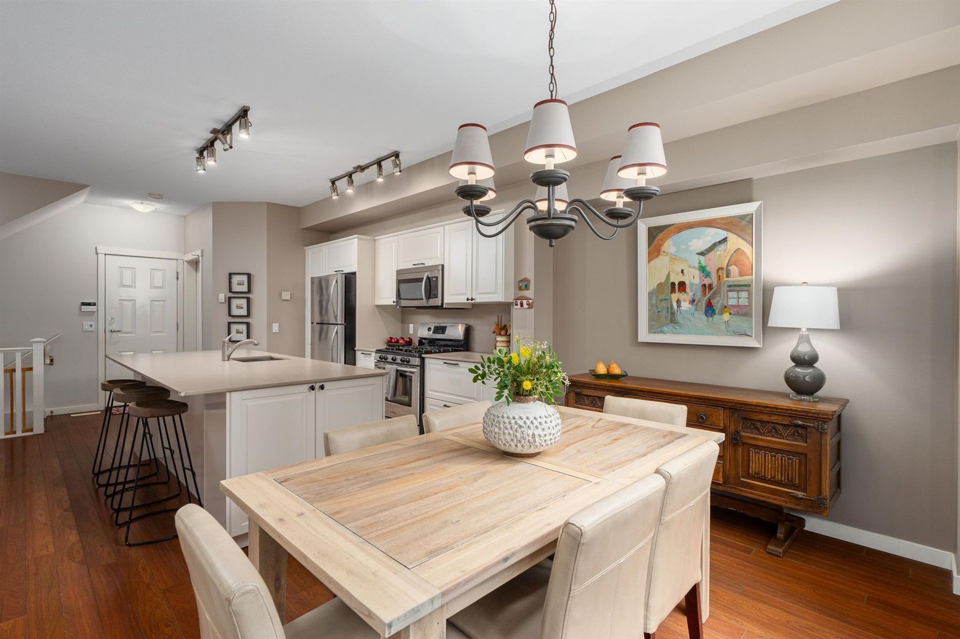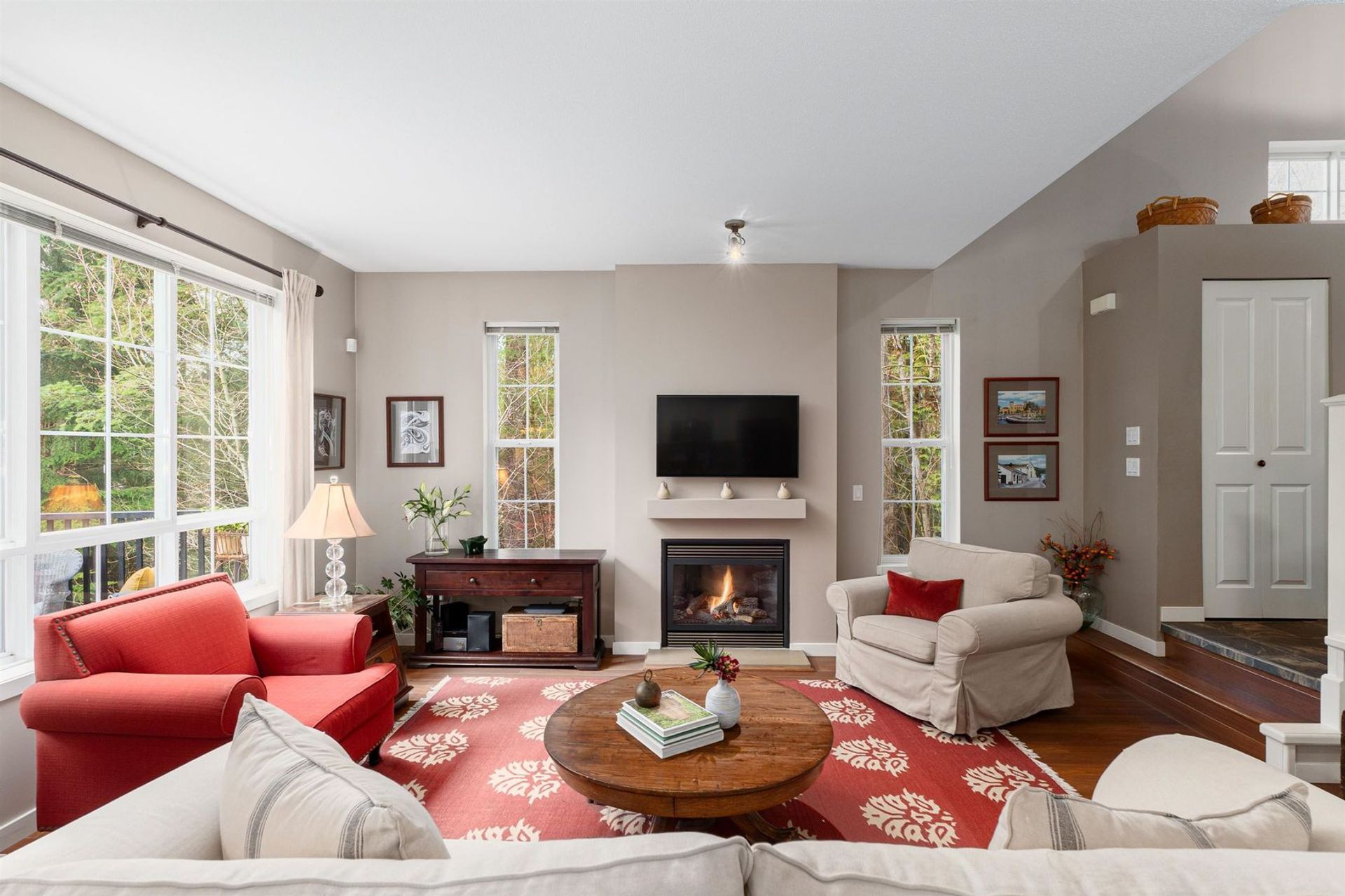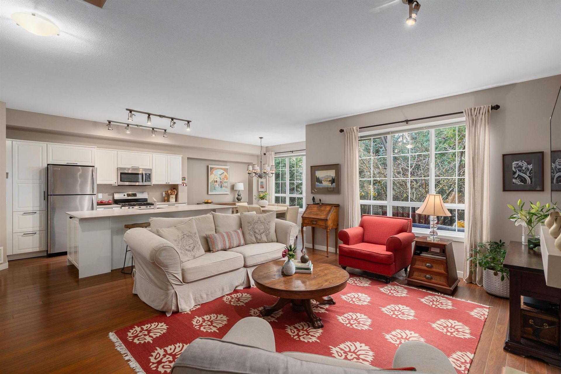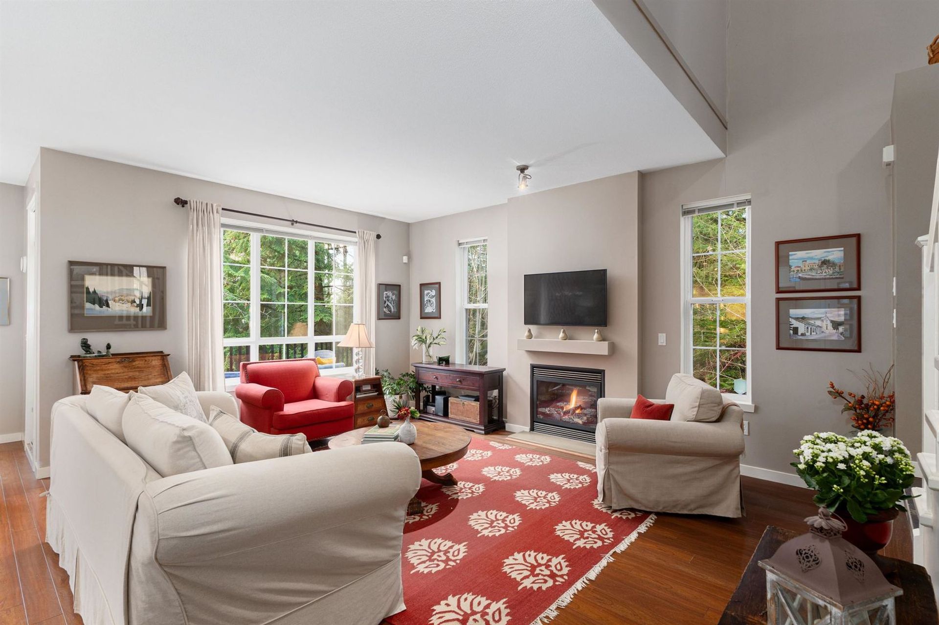 Your dream home has come to market in Port Moody! Step into this inviting great room w/ vaulted ceilings, dramatic oversized windows and total privacy. A large quartz eat-at island, attractive fireplace and updated kitchen creates a casual elegance to this happy home. A corner unit with greenbelt surroundings makes it feel like a detached home, w/ south facing sunlight and a sense of calm. Upstairs offers three, nicely spaced bedrooms. Double doors open to a generous primary… bedroom overlooking the greenbelt setting, with a spa-like ensuite and spacious walk in closet. Downstairs, a family room with fireplace & sliders to the covered patio & fenced backyard. Another bedroom, tucked away with a full bath, is perfect for a teen, a caregiver or spare room. 2 car garage and loads of storage..